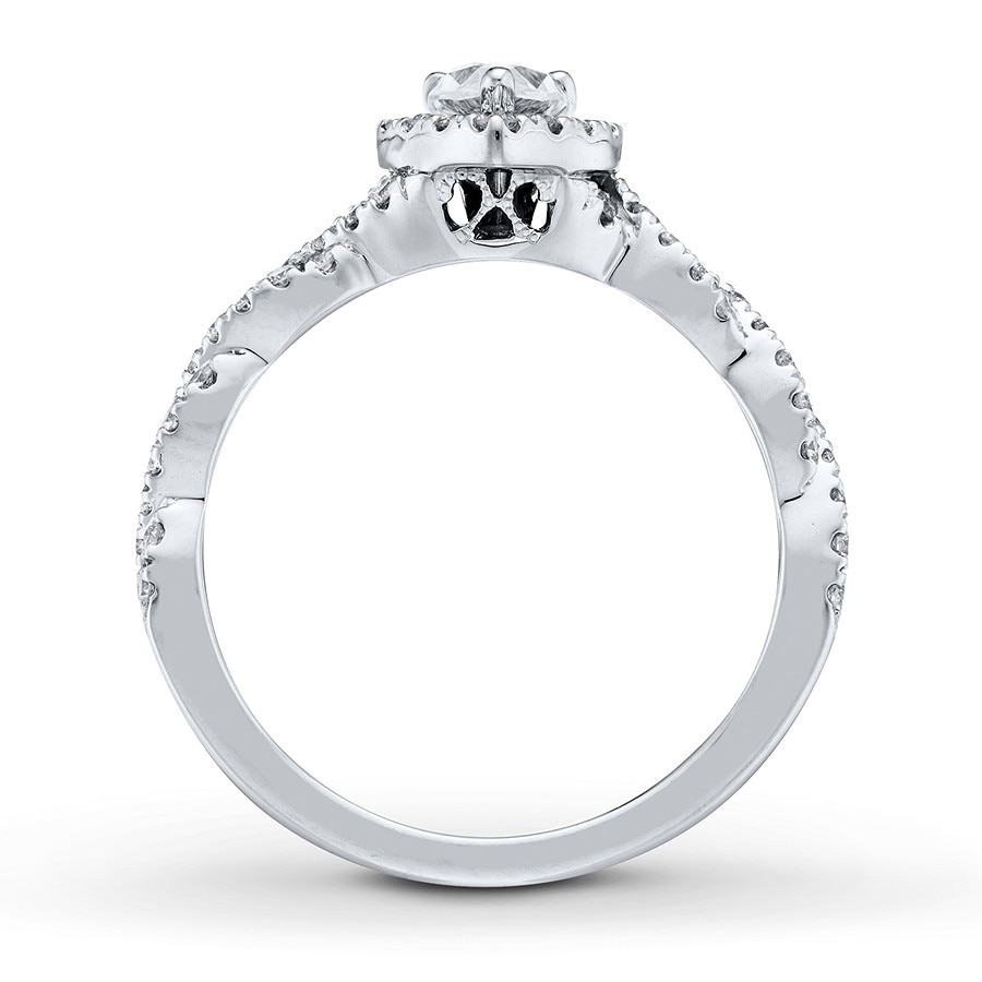 This glamorous engagement ring showcases a pear-shaped diamond, framed in round diamonds. Ribbons of round diamonds adorn the 14K white gold band for a total diamond weight of 3/4 carat.