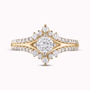 A stunning 1/2-carat round diamond sparkles at the center of this exquisite engagement ring. Set in timeless 14K yellow gold, the band is lined with two rows of brilliant round diamonds. The ring has a total diamond weight of 1 carat.